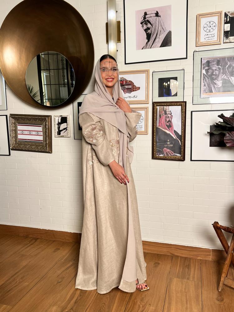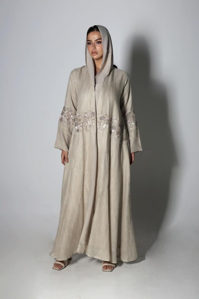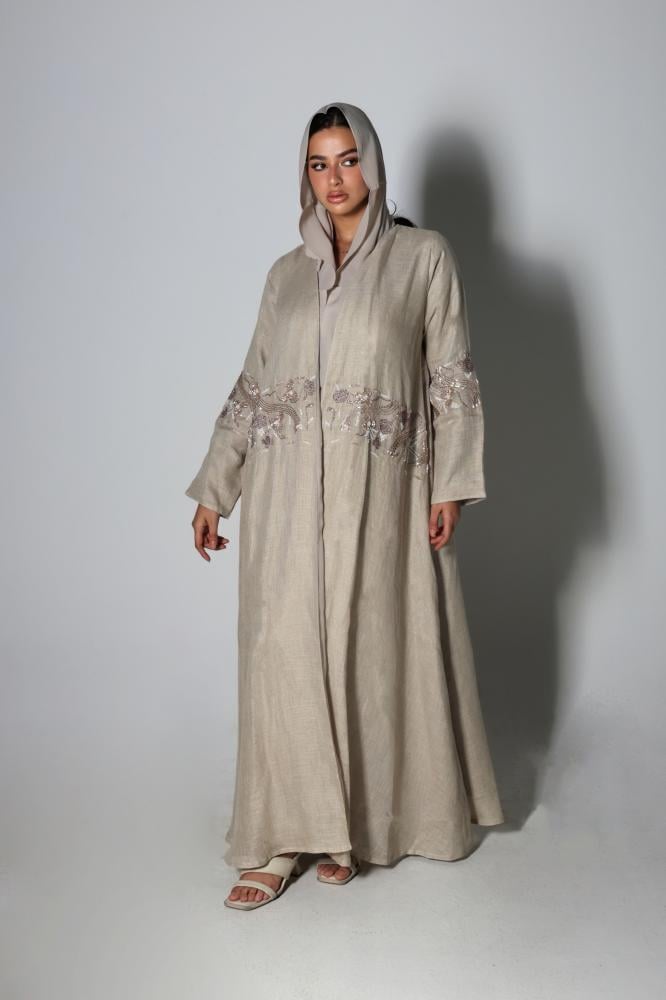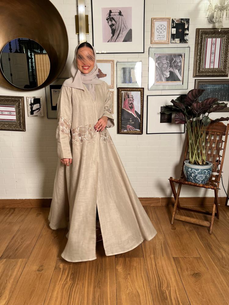 وصف العباية : عباية مصنوعة من اللينن الطبيعي مبطنة بالكامل مع تطريز يدوي في الجوانب و الأكمام .