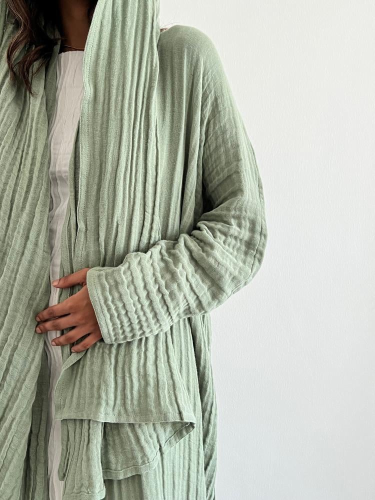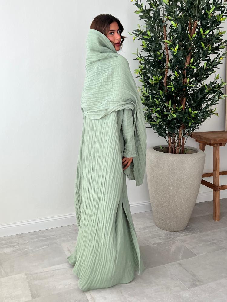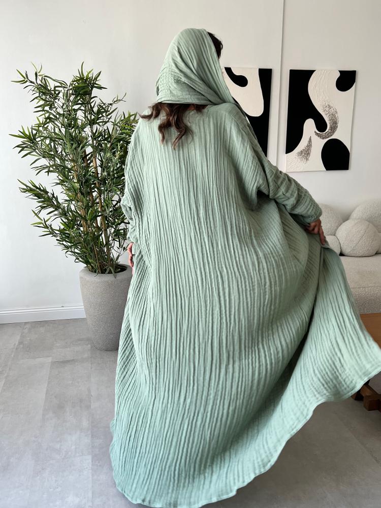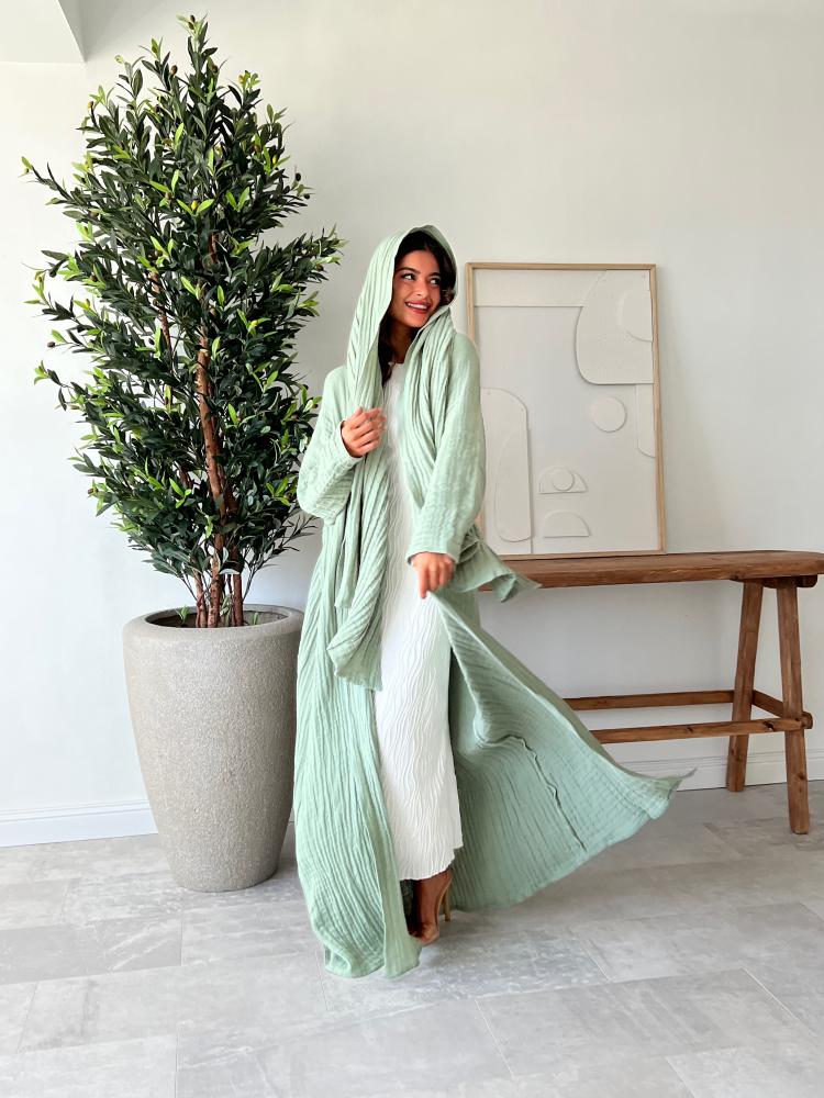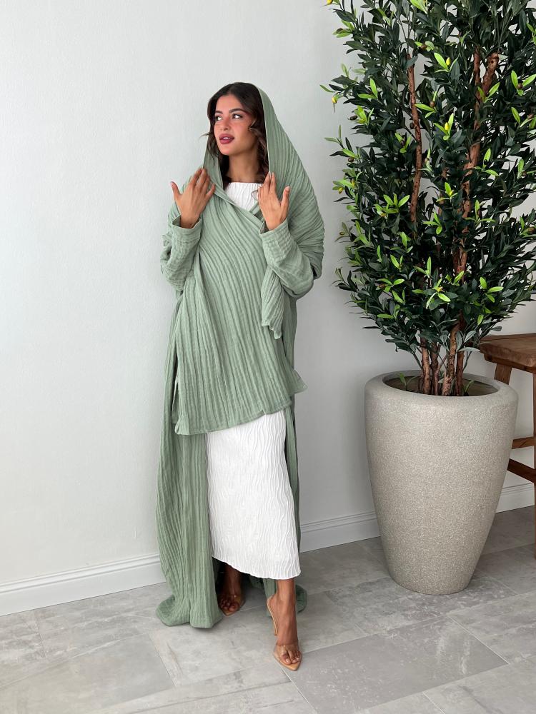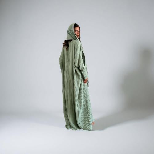 وصف العباية : عباية زيتي فاتح مصنوعة من اللينن الطبيعي 100% المكسر