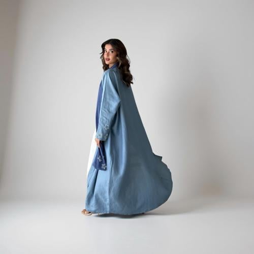 وصف العباية : عباية بلون ازرق مصنوعة من اللينن الطبيعي مع تطريز يدوي في الأكمام و الطرحة .